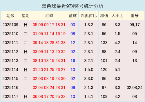 上期开奖数据中得知邻孤传比为1:4:1,大小比为4:2,开出1枚重号08,和值数据为109。 双色球最近9期奖号数据图表