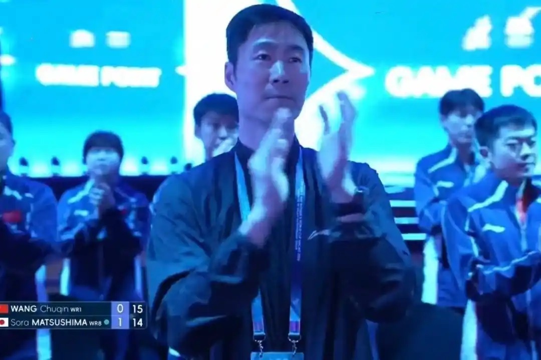 松岛辉空的场外指引是年青的日本双打名将森园政崇,王楚钦的场外指引是国乒男队主进修王皓。中国乒协主席王励勤,和一众进修与队员们,在场边不雅赛捧场。